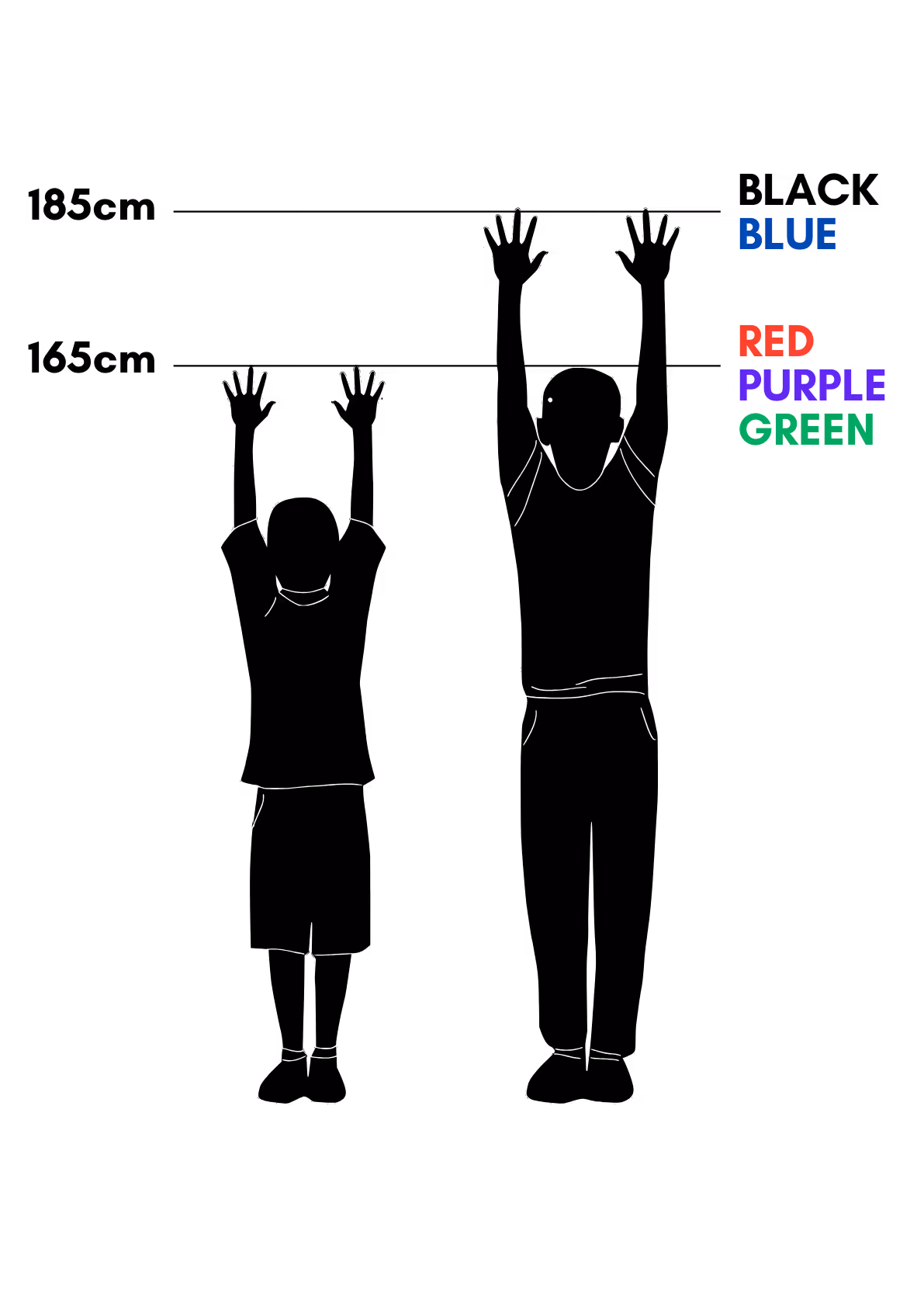 A reach of 165cm to the fingertipes for beginner/intermediate courses. A reach of 185cm to the fingertips for Blue & Black Courses